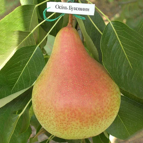Груша Осінь Буковини – осінній сорт з слабо згущеною кроною. До умов зростання не вибагливий, проте, потребує достатньої кількості тепла. Квіткові бруньки іноді з’являються вже на 2-4 році. Врожай плодів з одного дерева у віці восьми років складає – 24 кг, а у 12 років – 45 кг. Використовуючи підщепу айви можна добитись збільшенню ваги плоду з 250 грамів до 450 відповідно. Колір плодів жовтий. М’якоть ніжна та смачна, рожевого кольору. Достигають плоди в кінці вересня. Однією з переваг даного сорту є рівномірне достигання плодів та їх тривале не опадання.