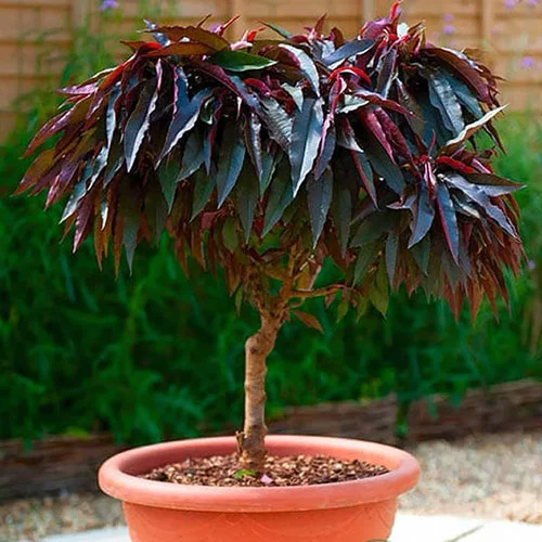 Дерево компактне, виростає до 150 см заввишки, крона округла, густа, лист тонкий, витягнутої форми, красивого бордового забарвлення.