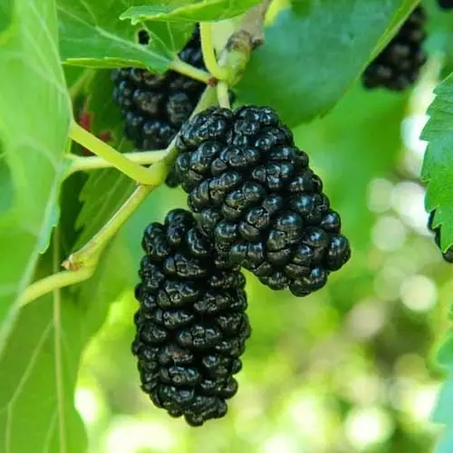 Плоди шовковиці – м'ясисті, соковиті та солодкі – спочатку світло-рожеві, згодом червоні та чорні, 3-5 см завдовжки. Плодоношення досить тривале - від липня до кінця серпня.