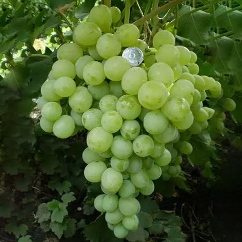 Грона циліндро-конічні, середньої щільності (500-700г, деякі 1500-2500г). Грона не схильні до горошення. Транспортабельність і товарність високі. Ягоди 15 - 18 г, округлі, зелено-жовтого кольору, з м'ясисто-соковитою м'якоттю і з'їдається з шкіркою. Сорт гармонійного, приємного мускатного смаку. Морозостійкість - 23-25 градусів. Стійкість до хвороб висока. Стійкість до мільдью та оїдіуму - 3 бали. Хороший сорт, що має дуже красиві, великі товарні грона з прекрасними смаковими якостями великих ягід.