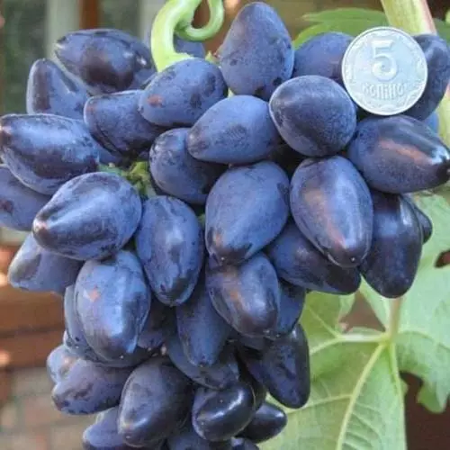 Грона можуть зберігатися на кущах до кінця вересня. Ягоди красиві, темно-синього кольору, з цікавою соскоподібною формою, великі (22 мм x 34 мм). Шкірочка тонка, не відчувається при їжі. М'якоть соковита, щільна з відмінним гармонійним смаком, солодка. Кущ сильнорослий з великими листками.